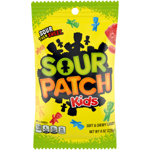 SOUR PATCH KIDS Soft & Chewy Candy packs all the classic flavor into a mischief-filled soft candy. SOUR PATCH KIDS chewy candy is a wholly delicious sweet treat that's SOUR. SWEET. GONE. Each bag contains sour candies in signature assorted fruit flavors that create a SOUR THEN SWEET treat to satisfy your taste buds. Add a little fun to your candy experience with the unique kid shapes that give these sour gummy snacks their name. A fat free food, this fruit flavored candy makes a great sour treat for multiple occasions. Keep SOUR PATCH KIDS sour gummy snacks on-hand for quick snacks or as party favors for Halloween, Valentine's Day or birthdays. This soft candy also makes a great movie theater candy to snack on during your favorite flick. Each package of bagged candy is the perfect size for stashing in purses, backpacks and lunchboxes for sour candies on-the-go. Stay stocked with sour candy so you're always ready with a sweet treat at snack time.