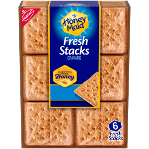 HONEY MAID Fresh Stacks Graham Crackers are delicious snacks, conveniently packaged in small stacks for maximum freshness and easy packing. Made with real honey, these cracker snacks have just the right amount of sweetness to keep you happy. These square honey grahams are a great size, and they stack deliciously with chocolate and marshmallows for campfire smores or fun party snacks for kids and adults. Keep these honey graham crackers in your desk for an afternoon snack, or pack some in a lunchbox for a quick treat on the go. Designed for freshness and simple storage, each box has six individual fresh stacks.