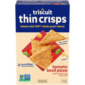 Triscuit Thin Crisps Tomato Basil Pizza Whole Grain Wheat Crackers are made simply with quality ingredients. Baked to perfection, these tomato basil crackers use 100% whole grain wheat proudly grown in the USA and sunflower oil. The triangle snack crackers are made with their signature woven texture for a satisfying crunch. Thin Crisps Tomato Basil Pizza Triscuit crackers are Non-GMO Project Verified, made without artificial colors or flavors and a good source of dietary fiber (see nutritional information for fat content) for delicious wholesome goodness. Enjoy the crunch of these delicious thin crackers on their own, or top with your favorite cheese, fruit, or flavorful spreads. Triscuit cracker snacks cover all of your snacking needs, whether you need lunch snacks for kids, snacks for adults or on the go snacks for traveling. Serve them at parties by creating a delicious charcuterie board featuring Triscuit crackers alongside your favorite cheese, meat, fruit, and vegetables for an easy appetizer.