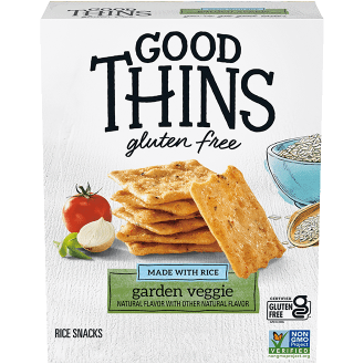 Enjoy a wholesome snack anytime, anywhere with GOOD THINS Garden Veggie Rice Gluten Free Crackers. Crafted with rice, these snack crackers are made with delicious goodness baked in every bite, and they're flavored with garden vegetables flavors like tomatoes, onions and bell peppers for a simply delicious snack. These square rice crackers are certified Gluten-Free by GFCO and Non-GMO Project Verified, and contain no artificial colors, artificial flavors, cholesterol or high fructose corn syrup making them delicious gluten free snacks for adults. Enjoy these light, crispy thin crackers by themselves, or pair them with cheese and dip for an easy party snack. These delicious snacks come in sealed 3.5 ounce packaging to lock in all the delicious goodness and make excellent travel snacks and lunch snacks for adults and kids.