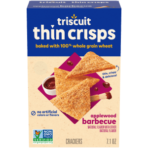 Triscuit Thin Crisps Applewood Barbecue Whole Grain Wheat Crackers are made simply with quality ingredients. Baked to perfection, these snack crackers use 100% whole grain wheat proudly grown in the USA and sunflower oil. The triangle snack crackers are made with their signature woven texture for a satisfying crunch. Thin Crisps Applewood Barbecue Triscuit crackers are Non-GMO Project Verified, made without artificial colors or flavors and a good source of dietary fiber (see nutritional information for fat content) for delicious wholesome goodness. Enjoy the crunch of these delicious thin crackers on their own, or top with your favorite cheese, fruit, or flavorful spreads. Triscuit cracker snacks cover all of your snacking needs, whether you need lunch snacks for kids, snacks for adults or on the go snacks for traveling. Serve them at parties by creating a delicious charcuterie board featuring Triscuit crackers alongside your favorite cheese, meat, fruit, and vegetables for an easy appetizer.