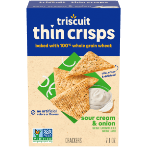 Triscuit Thin Crisps Sour Cream & Onion Whole Grain Wheat Crackers are made simply with quality ingredients. Baked to perfection, these snack crackers use 100% whole grain wheat proudly grown in the USA and sunflower oil. The triangle snack crackers are made with their signature woven texture for a satisfying crunch. Thin Crisps Sour Cream & Onion Triscuit crackers are Non-GMO Project Verified, made without artificial colors or flavors and a good source of dietary fiber (see nutritional information for fat content) for delicious wholesome goodness. Enjoy the crunch of these delicious thin crackers on their own, or top with your favorite cheese, fruit, or flavorful spreads. Triscuit cracker snacks cover all of your snacking needs, whether you need lunch snacks for kids, snacks for adults or on the go snacks for traveling. Serve them at parties by creating a delicious charcuterie board featuring Triscuit crackers alongside your favorite cheese, meat, fruit, and vegetables for an easy appetizer.